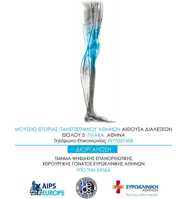 Το Τμήμα Ψηφιακής Επανορθωτικής Χειρουργικής Γόνατος της Ευρωκλινικής Αθηνών διοργανώνει, το Σάββατο 26 Σεπτεμβρίου 2015, στην αίθουσα διαλέξεων του Μουσείου Ιστορίας του Πανεπιστημίου Αθηνών, Θόλου 5 Πλάκα, και ώρα 17:00-22:00, ιατρική ημερίδα όπου θα παρουσιαστούν μεταξύ άλλων: