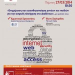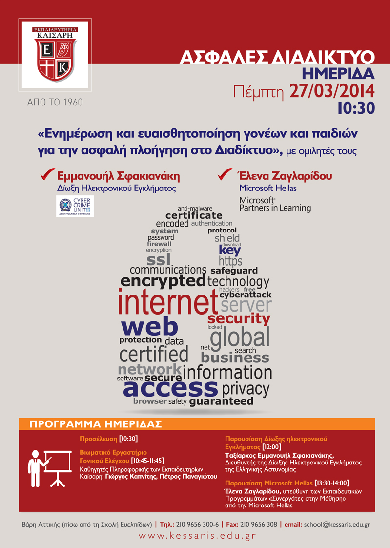 Την Πέμπτη 27 Μαρτίου 2014 και ώρα 12:00, τα Εκπαιδευτήρια Καίσαρη διοργανώνουν Ημερίδα με θέμα: «Ενημέρωση και ευαισθητοποίηση γονέων και παιδιών για την ασφαλή πλοήγηση στο Διαδίκτυο», με κεντρικούς ομιλητές τον Ταξίαρχο Εμμανουήλ Σφακιανάκη, διευθυντή της Δίωξης Ηλεκτρονικού εγκλήματος της Ελληνικής Αστυνομίας και την κυρία Έλενα Ζαγλαρίδου, υπεύθυνη των Εκπαιδευτικών Προγραμμάτων «Συνεργάτες στη Μάθηση» από την Microsoft Hellas.