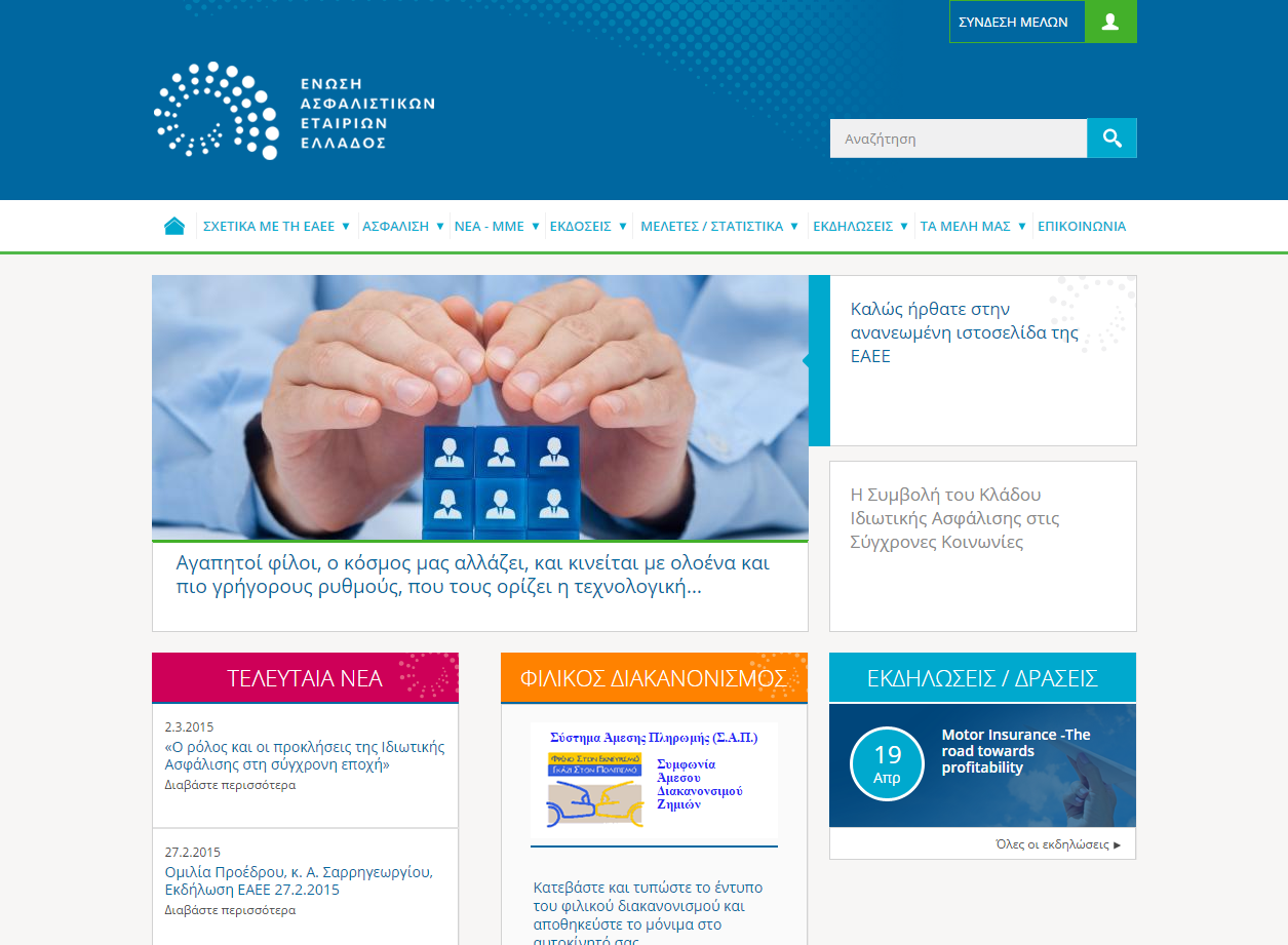 site eaeeΟ ανανεωμένος ιστότοπος της ΕΑΕΕ (www.eaee.gr) είναι στη διάθεσή σας. Με νέα εμφάνιση και ανανεωμένη δομή, το site της Ένωσης Ασφαλιστικών Εταιριών Ελλάδος (ΕΑΕΕ) σχεδιάστηκε ώστε να αποτελέσει ένα χρηστικό εργαλείο για τον επισκέπτη,  πρακτικό στην πλοήγηση και στην ανάγνωση.
