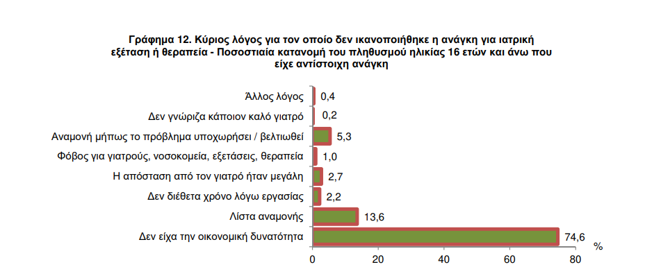 Ένας στους τέσσερις Έλληνες δεν μπορεί να κάνει εξετάσεις, να επισκεφτεί γιατρό ή να ακολουθήσει τη θεραπεία που πρέπει κυρίως λόγω οικονομικής δυσπραγίας με ότι αυτό μπορεί να συνεπάγεται για την επιβάρυνση της υγείας του και τη στήριξη της οικογένειας του.