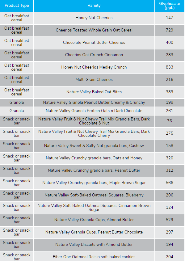 Η γλυφοσάτη βρέθηκε στα περισσότερα δείγματα και όπως θα δείτε στη λίστα του EWG που έχει ανακοινωθεί από τον Alexis Temkin, Ph.D. Τοξικολόγο, ανάμεσά τους είναι και τα Quaker Old Fashioned Oats, Quaker Steel Cut Oats , Kellogg’s Nutrigrain Soft Baked Breakfast Bars, Strawberry , Quaker Chewy Chocolate Chip granola bar , Nature Valley Crunchy Granola Bars, Oats ‘n Honey, Kellogg’s Cracklin’ Oat Bran oat cereal, Lucky Charms, Cheerios Toasted Whole Grain Oat Cereal, Quaker Simply Granola Oats, Honey, Raisins & Almonds κ.α. Στα συνολικά 45 δημητριακά που αναλύθηκαν τα 43 περιείχαν γλυφοσάτη και από τα 16 βιολογικά δημητριακά που αναλύθηκαν τα 5 περιείχαν γλυφοσάτη.