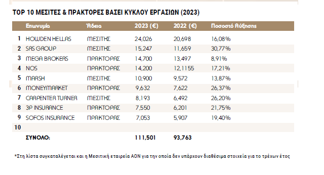 Δέκα διαμεσολαβητικές εταιρείες συγκεντρώνουν το μεγαλύτερο κύκλο εργασιών για το 2023, αθροίζοντας συνολικά πάνω από 111 εκατ. ευρώ.