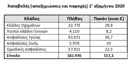 Σε σχέση με το πρώτο εξάμηνο του 2019, παρατηρήθηκε για τους λόγους που προαναφέρθηκαν, μείωση του ποσού αποζημιώσεων κατά 27%. Στους επιμέρους κλάδους, πληρώθηκαν σε ιδιοκτήτες οχημάτων για ζημίες 29,9 εκατ. ευρώ, ενώ εκτός κλάδου οχημάτων οι αποζημιώσεις έφθασαν στα 8,2 εκατ. με τον κλάδο πυρός (κατοικία – επιχείρηση) στα 3,6 εκατ. ευρώ.