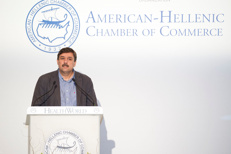 Στην συνέχεια του χαιρετισμού του, αναφέρθηκε στη φαρμακοβιομηχανία η οποία έχεις αναγνωριστεί ως ένας από τους τομείς που θα στηρίξουν το αναπτυξιακό μοντέλο της χώρας. Πιο συγκεκριμένα ανέφερε “Πρέπει να επεξεργάζονται αναπτυξιακές πολιτικές αντί να επανέρχονται οι μνημονιακές οριζόντιες μειώσεις τιμών που έχουν οδηγήσει τη φαρμακευτική δαπάνη σε επίπεδα μη βιώσιμα για τις επιχειρήσεις και επικίνδυνα για την υγεία του πολίτη. Αντί για οριζόντιες αδιέξοδες βραχυπρόθεσμες λύσεις, η Δημόσια Διοίκηση πρέπει πλέον να επεξεργασθεί σχέδιο περιορισμού του όγκου της φαρμακευτικής κατανάλωσης και παροχής κινήτρων για την ανάπτυξη της παραγωγής στην Ελλάδα”. Κλείνοντας ανέφερε “Το κατεξοχήν πρόβλημα της κοινωνίας και της Οικονομίας είναι σήμερα η ανεργία και η συνεπαγόμενη απώλεια των εξειδικευμένων επιστημόνων, των ταλαντούχων νέων, που μεταναστεύουν για να κερδίσουν τα προς το ζην. Το Ελληνο-Αμερικανικό Επιμελητήριο επιμένει στην ανάγκη να προχωρήσουν διαρθρωτικές μεταρρυθμίσεις που θα αλλάξουν το Οικονομικό περιβάλλον και να ληφθούν άμεσα μέτρα που θα σταθεροποιήσουν την κατάσταση στο χώρο της Υγείας, θα διασφαλίσουν την παροχή ποιοτικών υπηρεσιών υγείας στον πολίτη και θα διαμορφώσουν ένα περιβάλλον προσέλκυσης των επενδύσεων που έχει ανάγκη η Ελλάδα”.