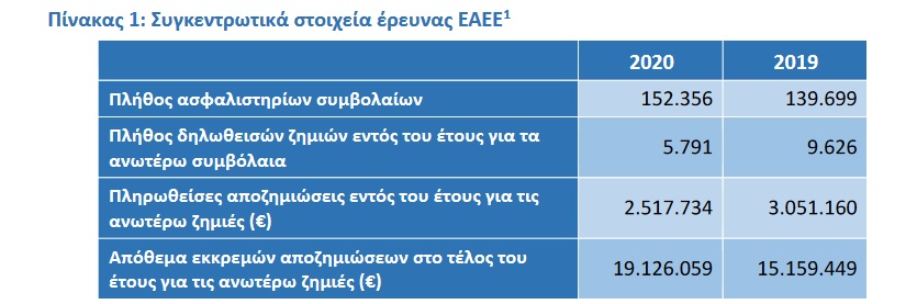 Ειδικότερα μέσα στο 2020 καταγράφονται 152,4 χιλιάδες συμβόλαια για τα οποία δηλώθηκαν 5,8 χιλιάδες ζημιές, πληρώθηκαν 2,5 εκατ. € και σχηματίστηκε απόθεμα εκκρεμών αποζημιώσεων ύψους 19,1 εκατ. €.