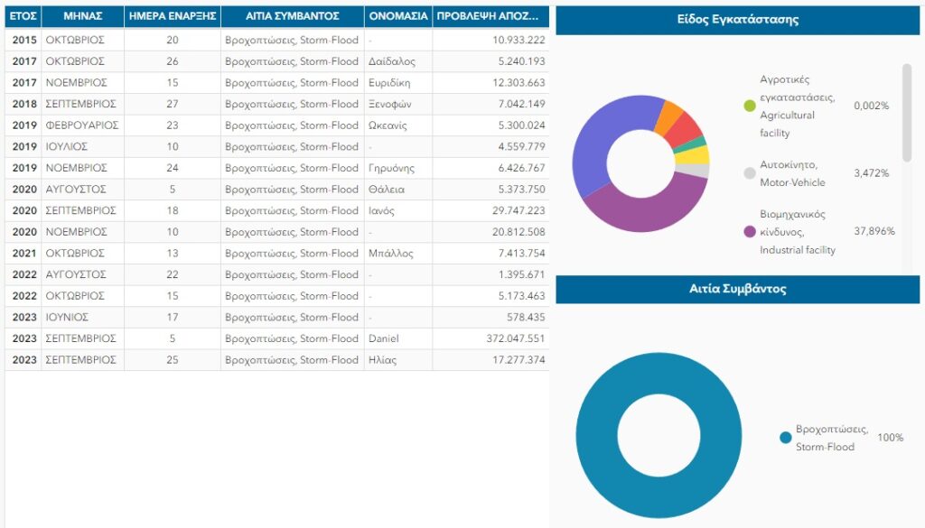 Το προηγούμενο έτος αναμφίβολα σημαδεύεται από τη μεγάλη πλημμύρα της Θεσσαλίας από την κακοκαιρία Daniel το Σεπτέμβριο με αποζημιώσεις 327 εκατ. ευρώ και εν συνεχεία την καταιγίδα Elias με αποζημιώσεις 17,2 εκατ. και τις βροχοπτώσεις του Ιουνίου με αποζημιώσεις άνω του μισού εκατομμυρίου.