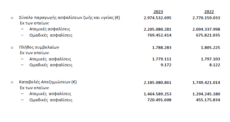 Η ασφαλιστική παραγωγή από τα ατομικά συμβόλαια υγείας και ζωής είναι αυξημένη κατά 5,2% ή κατά 110.742.283 ευρώ και το 2023 ανέρχεται σε 2.205.080.281.