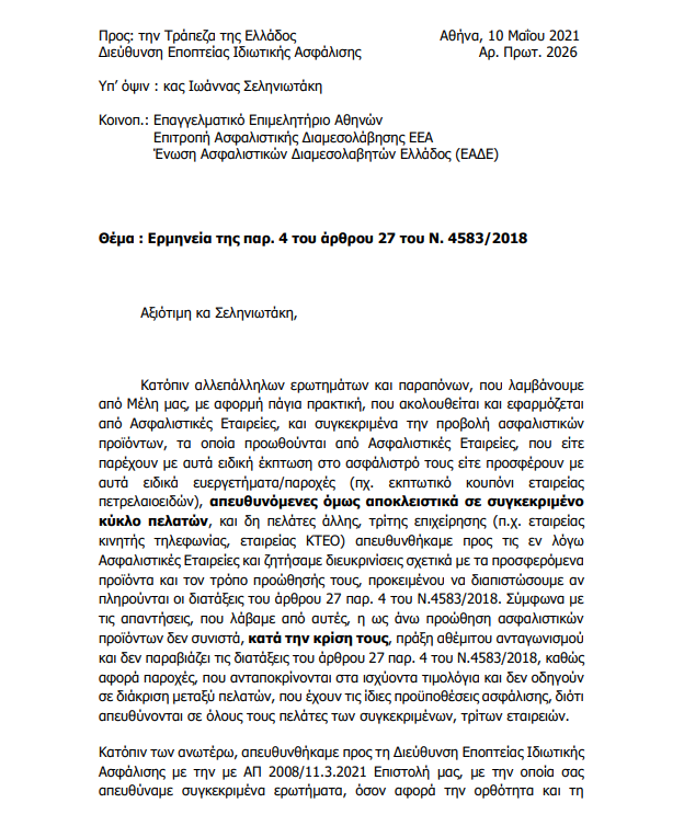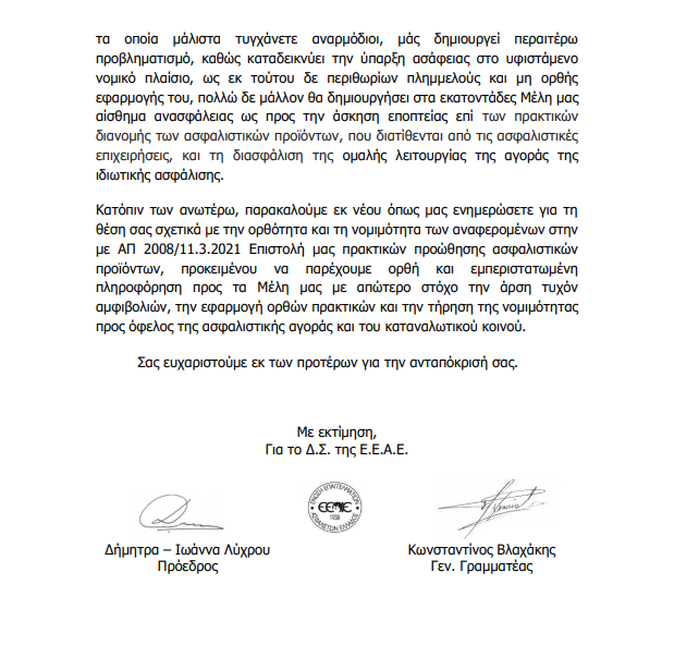 Μετά από αίτημα πολλών Μελών της, η ΕΕΑΕ δημοσιοποιεί τις επιστολές της στην ΔΕΙΑ, όπου αναφέρει τίς περιπτώσεις που παρατηρείται κατά την εκτίμησή της παρατυπία και μη τήρηση των προβλέψεων του Νόμου, προκειμένου τα Μέλη της αλλά και όλοι οι Ασφαλιστικοί Διαμεσολαβητές να γνωρίζουν τα σημεία που εστιάζει και επισημαίνει στην αναφορά της.