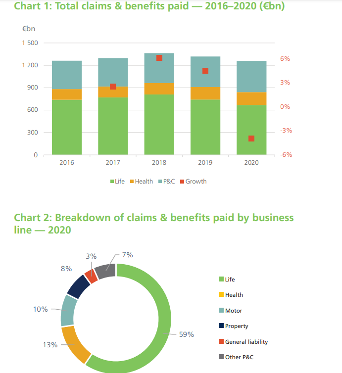 Τα συνολικά ασφάλιστρα στην Ευρώπη ανήλθαν σε 1.264 δισεκατομμύρια ευρώ το 2020, σημειώνοντας πτώση 4% σε σχέση με το 2019, και το μέσο κατά κεφαλήν ποσό που δαπανήθηκε για ασφάλιση στην Ευρώπη ήταν 2.093 ευρώ. Όσον αφορά στα υπό διαχείριση περιουσιακά στοιχεία του ευρωπαϊκού ασφαλιστικού κλάδου καταγράφεται αύξηση και από 10,4 τρισεκατομμύρια ευρώ το 2019 ανέρχονται σε 10,6 τρις ευρώ το 2020.