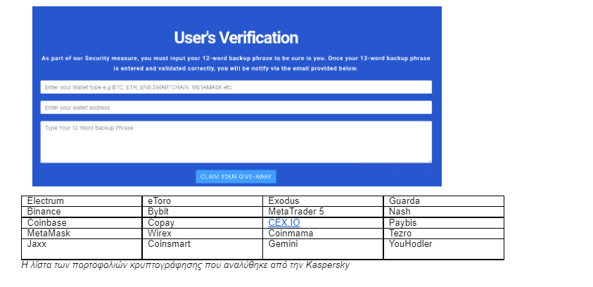 Οι ειδικοί της Kaspersky εξέτασαν προσεκτικά τις σελίδες phishing που απευθύνονται σε πιθανούς επενδυτές κρυπτονομισμάτων, καθώς και τα κακόβουλα αρχεία που διανέμονται με τα ονόματα των 20 πιο δημοφιλών πορτοφολιών κρυπτονομισμάτων.
