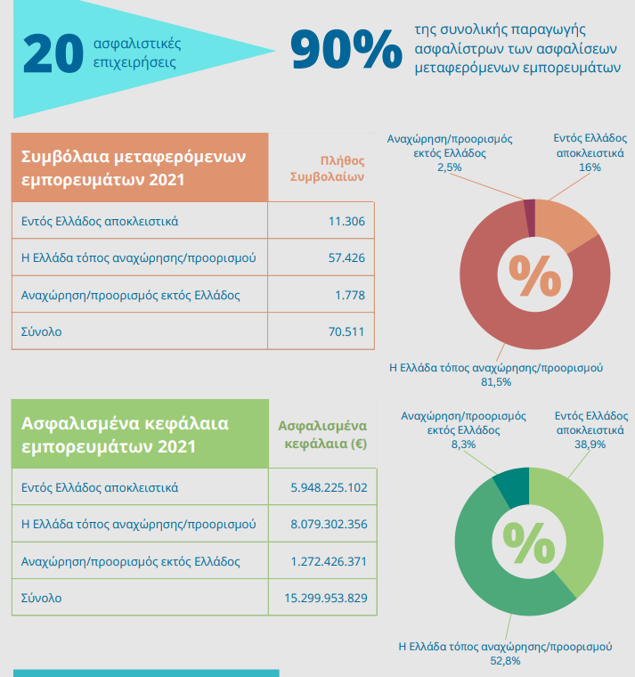 Αν και στο πλήθος συμβολαίων που αφορούν επιχειρήσεις με την Ελλάδα σαν τόπο αναχώρησης ή προορισμού αφορά το 81,5% του συνολικού αριθμού συμβολαίων, ωστόσο σε αυτές τις περιπτώσεις αντιστοιχεί το 52,8% των ασφαλισμένων κεφαλαίων.