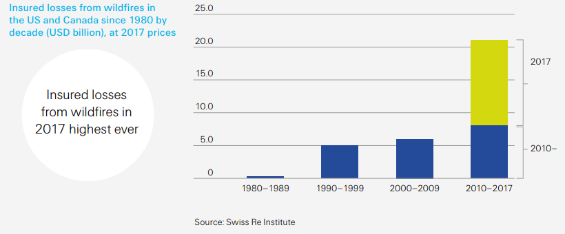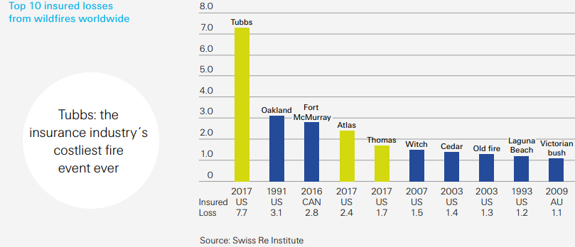 Τεράστιες ζημιές καταγράφονται και από πυρκαγιές ανά τον κόσμο, που οδηγούν τις ασφαλιστικές σε αποζημιώσεις 14 δισεκατομμυρίων δολαρίων. Αυτό είναι και το υψηλότερο ποσό που έχει ποτέ καταγραφεί σε ένα χρόνο λόγω πυρκαγιών. Μόνο η φωτιά Tubbs υπολογίζεται ότι κόστισε 7,7 δις.