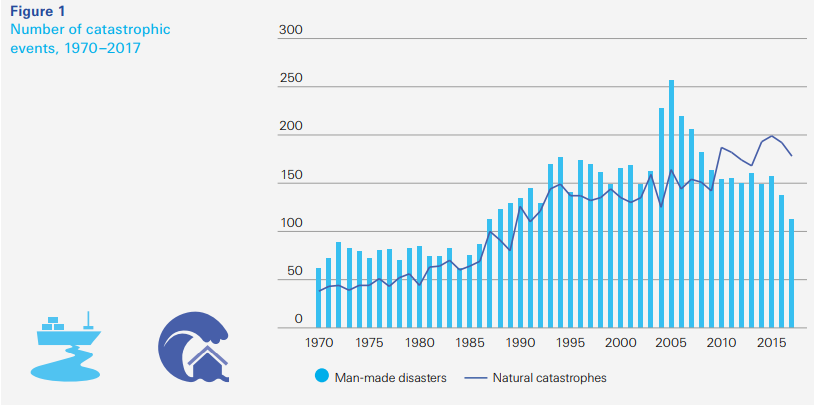 Οι παγκόσμιες οικονομικές απώλειες από φυσικές και ανθρωπογενείς καταστροφές το 2017 έφτασαν τα 337 δισεκατομμύρια δολάρια ΗΠΑ και ήταν σχεδόν διπλάσιες από το 2016, ενώ το τμήμα της συνολικής οικονομικής ζημίας που δεν καλύπτεται ασφαλιστικά το χρόνο που πέρασε είναι 193 δισ. “Ο ρυθμός αύξησης των οικονομικών ζημιών ξεπέρασε την αύξηση των ασφαλισμένων ζημιών τα τελευταία 26 χρόνια”, ανέφερε η έκθεση. “Οι ασφαλισμένες ζημίες αυξήθηκαν κατά 5,4% μεταξύ 1991 και 2017 και οι οικονομικές απώλειες κατά 5,9%.” “Το γεγονός ότι η περιουσία στις ΗΠΑ είναι υπο-ασφαλισμένη σημαίνει ότι πολλές επιχειρήσεις και νοικοκυριά δεν είχαν οικονομική κάλυψη για να τους βοηθήσουν να ανακάμψουν από τους τυφώνες”, αναφέρει η μελέτη. “Το χάσμα προστασίας είναι επίσης ένα σοβαρό ζήτημα σε πολλά νησιά της Καραϊβικής, τα οποία επηρέασαν οι τυφώνες”.
