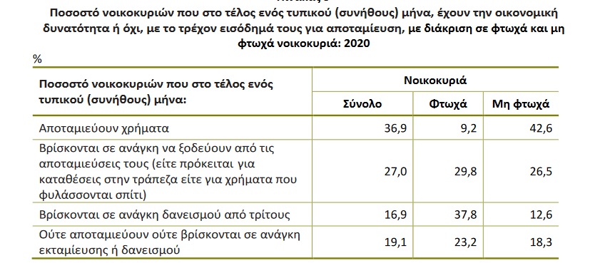 Όπως δείχνει η έκθεση της αρχής ένα στα τρία νοικοκυριά στην Ελλάδα δεν αποταμιεύει χρήματα και προκειμένου να καλύψει τα έξοδα του κάθε μήνα χρησιμοποιεί χρήματα που είχε ήδη στην άκρη.