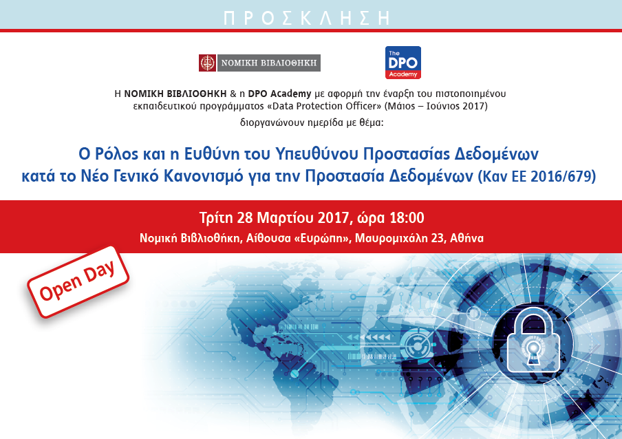 Το ρόλο που θα διαδραματίσει ο Data Protection Officer από 25.5.2018 σε επιχειρήσεις και δημόσιους φορείς θα συζητήσουν ομιλητές και συμμετέχοντες σε ειδική ημερίδα που θα πραγματοποιηθεί στις 28 Μαρτίου 2017 από τη Νομική Βιβλιοθήκη κια την DPO Academy.