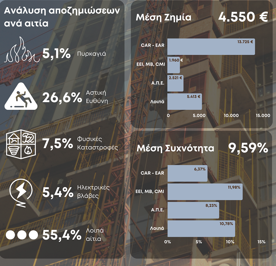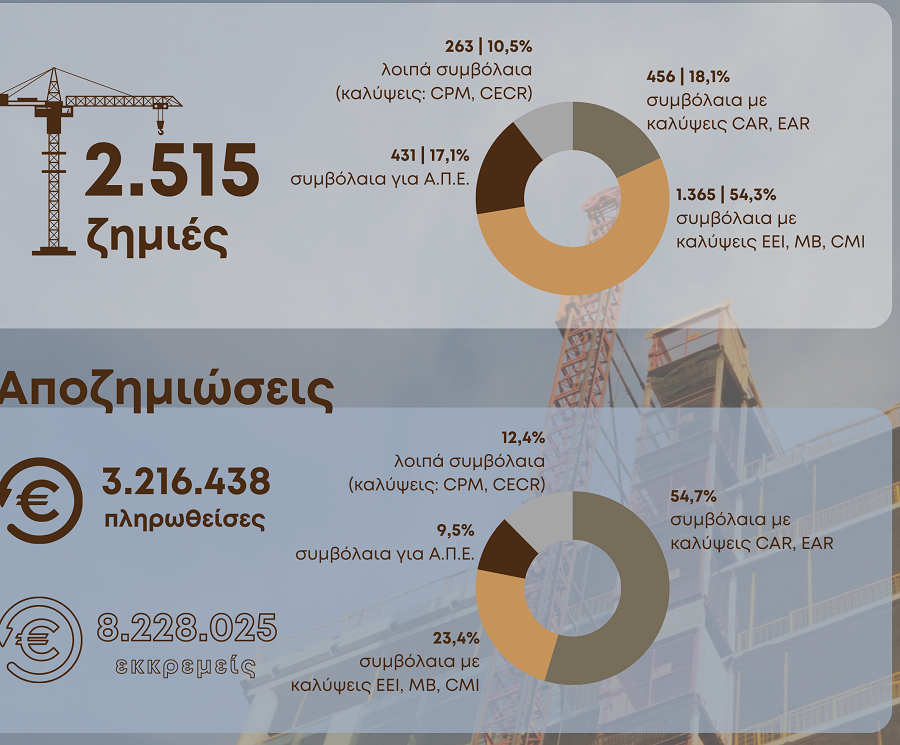Στα 3,2 εκατ. ευρώ ανέρχονται οι αποζημιώσεις των ασφαλιστικών εταιρειών για 2.515 υποθέσεις ζημιών εντός του 2022 που αφορούν σε οικοδομικά έργα, εγκαταστάσεις – συναρμολογήσεις κτιρίων, μηχανικών βλαβών και μηχανημάτων, ευθύνης πολιτικού μηχανικού κ.α.