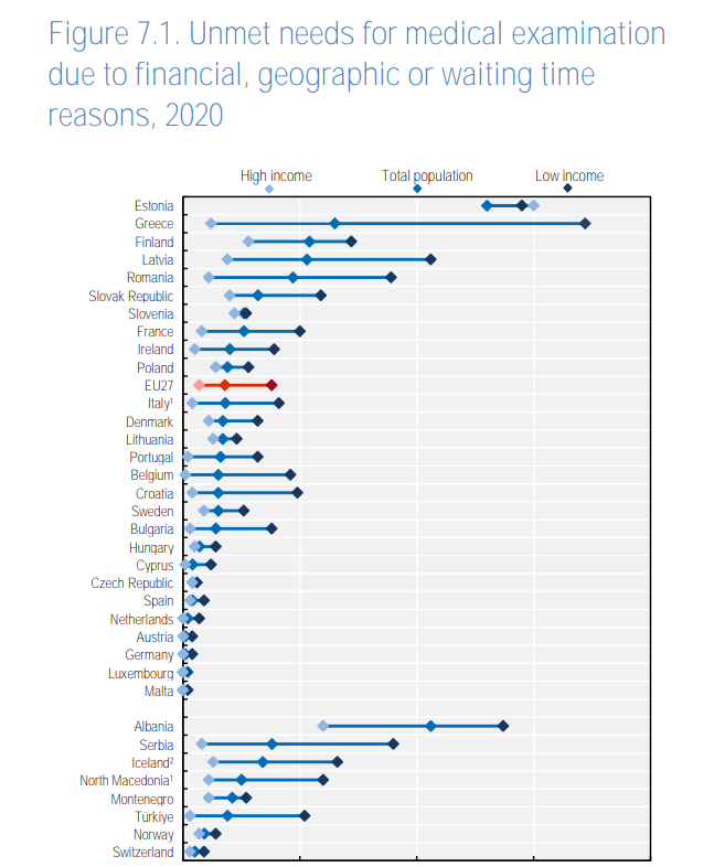 Στην έκθεση που δημοσίευσε η Ευρωπαϊκή Επιτροπή το 2022 η Ελλάδα καταγράφει το μεγαλύτερο ποσοστό ανεκπλήρωτων ιατρικών αναγκών σε νοικοκυριά με χαμηλό εισόδημα. Περίπου το 17% των ανθρώπων με χαμηλά εισοδήματα δηλώνουν ότι δεν έχουν πρόσβαση σε υπηρεσίες και δομές υγείας.