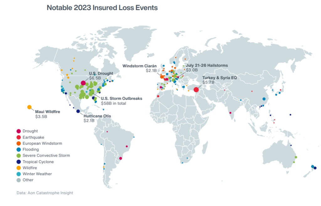 Αν και τα πιο καταστροφικό γεγονός ήταν ο σεισμός που έπληξε Τουρκία και Συρία τον Φεβρουάριο με δεκάδες χιλιάδες νεκρούς, ωστόσο οι σοβαρές καταιγίδες ήταν ο πιο επιζήμιος κίνδυνος για την ασφαλιστική βιομηχανία.