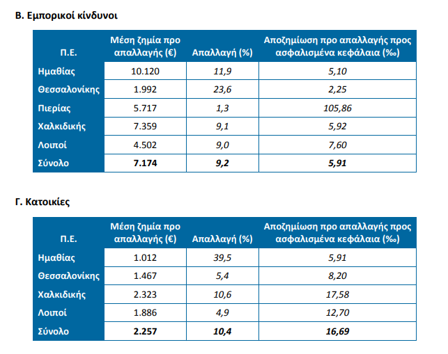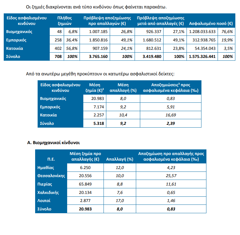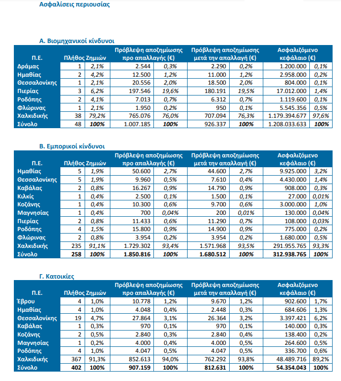 Εξ΄ αιτίας των ακραίων καιρικών φαινομένων, δηλώθηκαν συνολικά στις συμμετέχουσες επιχειρήσεις 708 ζημιές επί των ασφαλίσεων περιουσίας με ποσό πρώτης εκτίμησης για αποζημίωση της τάξης των 3,8 εκατ. €, άρα η μέση δηλωθεί σα ζημία φθάνει τα 5.318 €. Για τις εν λόγω ζημιές, η εκτίμηση των αποζημιώσεων μετά τις απαλλαγές (όπου υφίστανται) είναι 3,4 εκατ. €. Οι περισσότερες ζημιές σε πλήθος και ποσό προ απαλλαγής συνέβησαν στην ΠΕ Χαλκιδικής. Επίσης, αρκετές ζημιές δηλώθηκαν στις ΠΕ Ημαθίας, Θεσσαλονίκης και Πιερίας. Ακολουθούν οι δείκτες των περιοχών με τις περισσότερες ζημιές.
