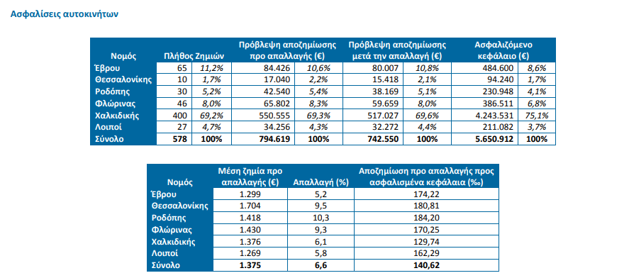 Ως προς τις ασφαλίσεις αυτοκινήτων, δηλώθηκαν συνολικά στις συμμετέχουσες επιχειρήσεις της έρευνας 578 ζημιές με ποσό πρώτης εκτίμησης για αποζημίωση της τάξης των 795 χιλ. €, άρα η μέση δηλωθείσα ζημία φθάνει τα 1.375€. Οι συνολικές αποζημιώσεις μετά από τις απαλλαγές φθάνουν τα 743 χιλ. €. Το σύνολο των ασφαλισμένων κεφαλαίων που επλήγησαν ανέρχεται σε 5,7 εκατ. €. Οι αποζημιώσεις προ απαλλαγών έφθασαν στα 140,62‰ των ασφαλισμένων κεφαλαίων. Τέλος, η μέση απαλλαγή ανήλθε στο 6,6% των αποζημιώσεων. Οι περισσότερες ζημιές σε πλήθος και σε ποσό εντοπίστηκαν στην ΠΕ Χαλκιδικής, ενώ αρκετές ζημιές δηλώθηκαν επίσης στις ΠΕ Θεσσαλονίκης, Έβρου, Ροδόπης, Φλώρινας .