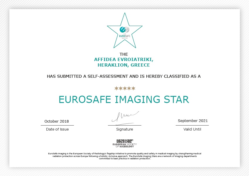 Και προσθέτει «Η καθημερινή προσπάθεια και συνεργασία μεταξύ των ιατρών και τεχνολόγων μας, με την αμέριστη προσπάθεια της υπεύθυνης ακτινοφυσικού της Affidea, κας Κάτιας Κατσάρη, βλέπουμε να αποφέρει καρπούς. Είναι μεγάλη ικανοποίηση για όλους εμάς που το διαγνωστικό κέντρο του Hρακλείου βραβεύτηκε με 5 αστέρια από το θεσμό Eurosafe Imaging – Wall of Stars με έδρα τη Βιέννη. Σκοπός μας είναι και τα λοιπά κέντρα να λάβουν αντίστοιχη βράβευση και εργαζόμαστε πάνω σε αυτό. Η προσπάθεια αυτή ανταμείβεται και η διαφορά της χαμηλότερης ακτινικής επιβάρυνσης σαφώς μετράει για τους ασθενείς μας».