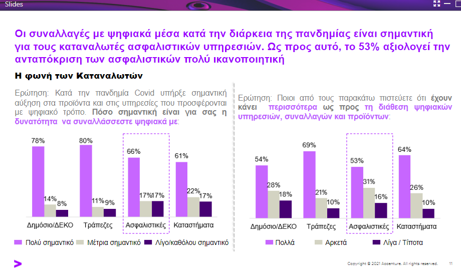 Στην έρευνα οι καταναλωτές σε ποσοστό 83% αξιολόγησαν ότι στην πανδημία ήταν σημαντική η δυνατότητα να συναλλάσσονται ψηφιακά με ασφαλιστικές. Μάλιστα το 84% των συμμετεχόντων απαντά πως οι ασφαλιστικές έχουν κάνει από αρκετά έως πολλά για τη διάθεση ψηφιακών υπηρεσιών, συναλλαγών και προϊόντων.