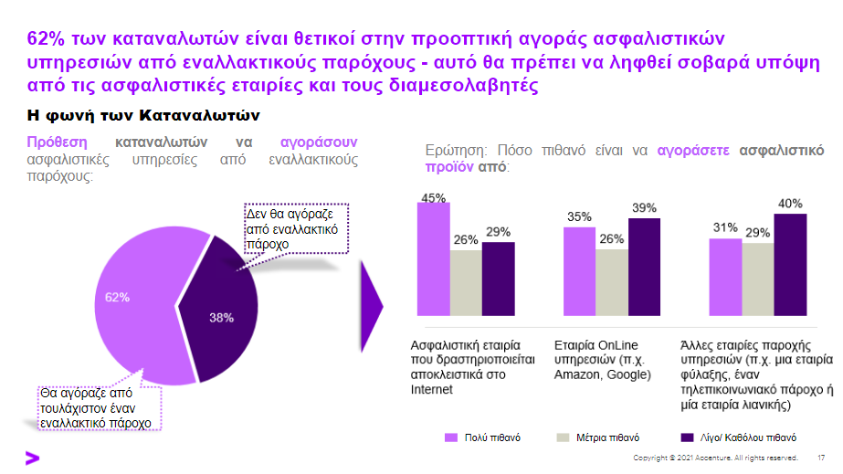 Έξι στους 10 Έλληνες θα αγόραζαν ασφαλιστικά προγράμματα από την Google, την Amazon, εταιρείες τηλεπικοινωνίας, λιανεμπορίου ή άλλο εναλλακτικό πάροχο, εκτός της ασφαλιστικής αγοράς.
