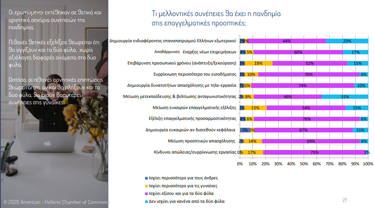 Το Ελληνο-Αμερικανικό Εμπορικό Επιμελητήριο συνεχίζοντας να παρακολουθεί στενά όλες τις εξελίξεις και με σκοπό πάντα τη διεξαγωγή χρήσιμων συμπερασμάτων για τις αλλαγές που θα διαμορφώσουν την επόμενη μέρα, σε συνεργασία με την Επιτροπή Women in Business (WIB) προχώρησε στη διεξαγωγή έρευνας για τις επιπτώσεις του Covid-19 στην καθημερινότητα αλλά και την εργασία. Στην ερώτηση τι μελλοντικές συνέπειες εξίσου και για τα δύο φύλλα απορρέουν από την πανδημία, το 75% απάντησε “κινδύνους απώλειας/συρρίκνωσης εργασίας”.