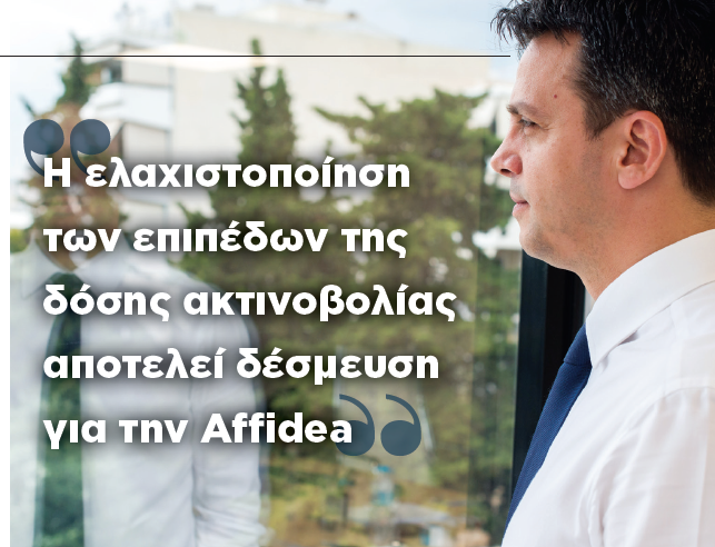 Κύριο μέλημα της Affidea είναι η ασφάλεια του εξεταζομένου. Για αυτό και στις μέρες μας που η τεχνολογία είναι πιο σημαντική όσο ποτέ για την υγεία, δεν διστάζουμε να επενδύουμε σε τελευταίου τύπου μηχανήματα αλλά και σε πρωτοποριακές μεθόδους οι οποίες συμβάλλουν στην ασφαλή, έγκαιρη και έγκυρη διάγνωση και κατ’ επέκταση στην αποτελεσματικότερη θεραπεία του ασθενούς. Στην Affidea δίνοντας έμφαση σε όλους τους τύπους ασφάλειας προς τους εξεταζόμενους, υιοθετούμε και εφαρμόζουμε τεχνολογίες που συνδράμουν με ποιοτικά κριτήρια στη βελτίωση των υπηρεσιών μας. Συγκεκριμένα έχουν τεθεί σε εφαρμογή μια σειρά διαδικασιών που αποσκοπούν στη διαφύλαξη της ασφάλειας των εξεταζομένων και παράλληλα στη διασφάλιση του καλύτερου δυνατού ιατρικού αποτελέσματος. Στο πλαίσιο αυτό, η Affidea έχει ξεκινήσει μια καμπάνια Βελτιστοποίησης της Δόσης Ακτινοβολίας για την ασφαλέστερη δυνατή διεξαγωγή των απεικονιστικών εξετάσεων. Το σύνολο των διαγνωστικών κέντρων της Affidea Ελλάδος που συμμετέχουν στο πρόγραμμα Dose Excellence περιλαμβάνονται στη λίστα “EuroSafe Wall of Stars”, των καλύτερων της Ευρώπης από πλευράς ακτινοπροστασίας. Η ελαχιστοποίηση των επιπέδων της δόσης ακτινοβολίας αποτελεί δέσμευση για την Affidea. Κατά συνέπεια, σε ό,τι αφορά τη δόση ακτινοβολίας ακολουθούμε την Αρχή της ALARA (As Low As Reasonably Achievable), δηλαδή τη χαμη- λότερη δυνατή για την παραγωγή άρτια διαγνωστικά εικόνων. Αυτό επιτυγχάνεται με τη χρήση κορυφαίου ιατρικού εξοπλισμού που υποβάλλεται σε τακτικούς και περιοδικούς ελέγχους συντήρησης και αναβάθμισης βάσει προδιαγραφών, την υποβολή των μηχανημάτων μας σε ενδελεχείς ελέγχους ποιότητας που διεξάγονται από εξειδικευμένους ιατρούς, την παρακολούθηση των επιπέδων της δόσης ακτινοβολίας και τέλος την εκπαίδευση του προσωπικού στη βελτιστοποίηση των παραμέτρων στα πρωτόκολλα των απεικονιστικών εξετάσεων. Προς αυτή την κατεύθυνση διατηρούμε ειδική ομάδα ακτινοπροστασίας προκειμένου να ελέγχει τα καταχωρημένα στοιχεία της χορηγούμενης δόσης ακτινοβολίας, να βελτιστοποιεί τα πρωτόκολλα και να αναπτύσσει ορθές πρακτικές.