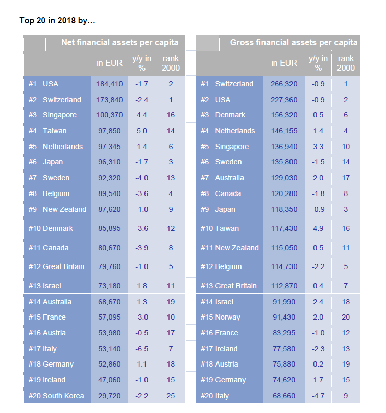 Τα καθαρά χρηματοοικονομικά περιουσιακά στοιχεία στην Ελλάδα μειώθηκαν κατά 9,6% το 2018. Με κατά κεφαλήν χρηματοοικονομικά περιουσιακά στοιχεία 13.090 ευρώ, η Ελλάδα έπεσε τέσσερις θέσεις, στην 31η, της κατάταξης των πλουσιότερων χωρών. Στην κορυφή, οι ΗΠΑ αντικατέστησαν πάλι την Ελβετία, κυρίως λόγω του ισχυρού δολαρίου. Το 2000, η Ελλάδα βρισκόταν στην 21η θέση. Επομένως, ανήκει στην ομάδα των «χαμένων» – μαζί με κάποιες άλλες χώρες της Ευρωζώνης, όπως η Ιταλία (-10 θέσεις), η Γαλλία (-5 θέσεις) και το Βέλγιο (-4 θέσεις), οι οποίες έπεσαν αρκετά από το 2000. Από την άλλη πλευρά, στους νικητές περιλαμβάνονται η Σιγκαπούρη (+13 θέσεις) και η Ταϊβάν (+10 θέσεις), καθώς επίσης και η Σουηδία (+6 θέσεις), η Αυστραλία (+5 θέσεις) και η Νότια Κορέα (+5 θέσεις).