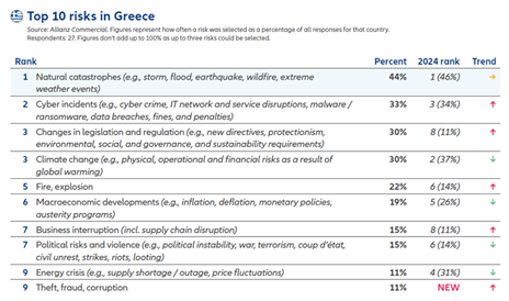 Στην Ελλάδα, οι φυσικές καταστροφές (σεισμοί, πλημμύρες, καταιγίδες, πυρκαγιές) παραμένουν ο κορυφαίος κίνδυνος, με ποσοστό 44%. Ακολουθούν οι κυβερνοεπιθέσεις με 33% στη δεύτερη θέση, ενώ η κλιματική αλλαγή και οι αλλαγές στη νομοθεσία και τους κανονισμούς καταλαμβάνουν την τρίτη θέση, με ποσοστό 30% και οι δύο. Σημαντική είναι η άνοδος των κινδύνων από πυρκαγιές και εκρήξεις (22%) και από διακοπές στην επιχειρηματική δραστηριότητα και την αλυσίδα εφοδιασμού (15%). Αντίθετα, οι πολιτικοί κίνδυνοι και η ενεργειακή κρίση σημειώνουν μείωση σε σχέση με το 2024, ενώ η κλοπή, η απάτη και η διαφθορά κάνουν την εμφάνισή τους στην έρευνα, με ποσοστό 11%.