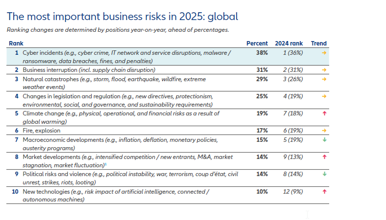Οι κυβερνοεπιθέσεις, όπως παραβιάσεις δεδομένων ή επιθέσεις ransomware, και διακοπές λειτουργίας συστημάτων IT, όπως το περιστατικό της CrowdStrike, αποτελούν τη μεγαλύτερη ανησυχία για τις επιχειρήσεις παγκοσμίως το 2025, σύμφωνα με την έκθεση Allianz Risk Barometer. Η διακοπή της επιχειρηματικής δραστηριότητας παραμένει επίσης κύρια ανησυχία για επιχειρήσεις όλων των μεγεθών, καταλαμβάνοντας τη 2η θέση. Μετά από μία ακόμη χρονιά έντονων φυσικών καταστροφών το 2024, η συγκεκριμένη απειλή διατηρείται στην 3η θέση.