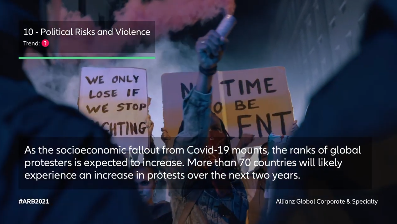 Τους μεγαλύτερους κινδύνους με τους οποίους έρχονται στην εποχή του Covid-19 αντιμέτωπες οι επιχειρήσεις χαρτογραφεί το Allianz Risk Barometer 2021, που έγινε βάσει των απαντήσεων 2.769 αναλυτών από 92 χώρες.