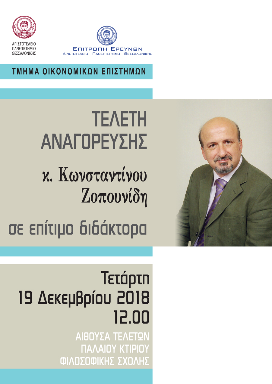 Την Τετάρτη στις 19 Δεκεμβρίου θα πραγματοποιηθεί η τελετή αναγόρευσης του Κ. Ζοπουνίδη, σε επίτιμο διδάκτορα του Αριστετελείου Πανεπιστημίου. Η εκδήλωση θα πραγματοποιηθεί στην αίθουσα τελετών του παλαιού κτιρίου της Φιλοσοφικής Σχολής.