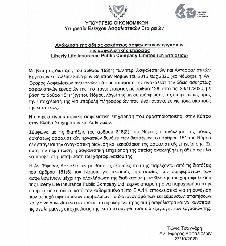 Την ανάκληση της λειτουργίας της ασφαλιστικής εταιρείας Liberty Life Insurance αποφάσισε το Υπουργείο Οικονομικών της Κύπρου λόγω της μη συμμόρφωσης της εταιρείας ως προς την υποχρέωση της για την υποβολή πληροφοριών που είναι αναγκαίες για την εποπτεία της.