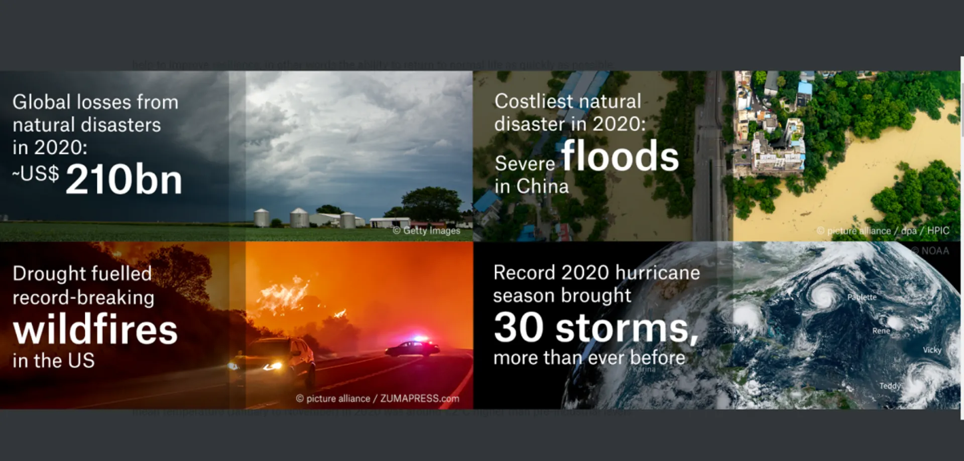 Από τις συνολικές ζημιές ασφαλισμένα ήταν περίπου τα 82 δισεκατομμύρια δολάρια, δηλαδή περίπου το 40%. Από το 2019 στο 2020 οι φυσικές καταστροφές επηρέασαν περισσότερο τις κοινωνίες και τις οικονομίες καθώς οι συνολικές ζημίες όσο και οι ασφαλισμένες απώλειες ήταν σημαντικά υψηλότερες (2019: 166 δισεκατομμύρια δολάρια ΗΠΑ και 57 δισεκατομμύρια δολάρια ΗΠΑ αντίστοιχα).