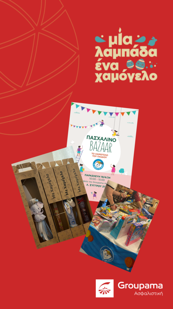 Η Groupama Ασφαλιστική στέκεται αρωγός δίπλα σε έναν Οργανισμό που καθημερινά παράγει ένα πραγματικά σπουδαίο έργο προς τα παιδιά, «Το Χαμόγελο του Παιδιού», ενώ παράλληλα, φιλοξενώντας το φετινό πασχαλινό bazaar του Οργανισμού, μεταδίδει ένα ισχυρό μήνυμα κοινωνικής αλληλεγγύης και προσφοράς. Η Groupama Ασφαλιστική εκφράζει τις θερμές της ευχαριστίες σε όλους όσοι συνέβαλαν στην επιτυχή υλοποίηση αυτής της δράσης και στέλνει τις καλύτερες ευχές της για Καλή Ανάσταση και Καλό Πάσχα, με υγεία, αγάπη και χαμόγελα.