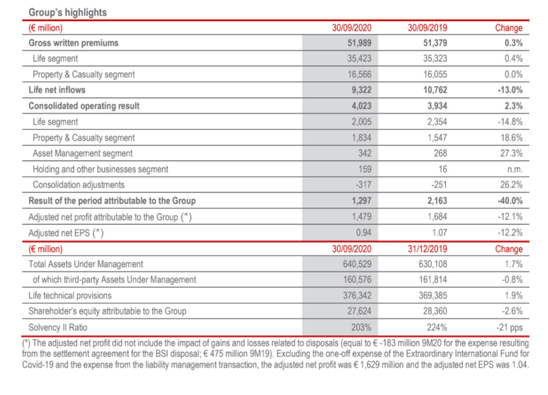 Ο CFO του Group Generali, Cristiano Borean, σχολίασε ότι «τα αποτελέσματα για τους πρώτους εννέα μήνες δείχνουν πως ο όμιλος είναι ανθεκτικός από τα εξαιρετικά τεχνικά περιθώρια, το λειτουργικό αποτέλεσμα και την κεφαλαιακή θέση. Σε ένα περιβάλλον που συνεχίζει να επηρεάζεται από την πανδημική κρίση ο όμιλος επιβεβαιώνει τα πλεονεκτήματά του λόγω της ηγετικής του θέσης στην Ευρώπη . Η Generali παραμένει προσηλωμένη στη δέσμευσή της στους πελάτες της.