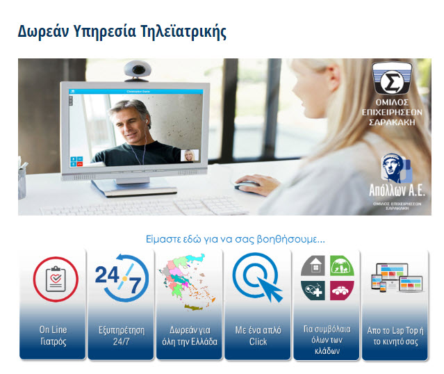 Δωρεάν υπηρεσία τηλεϊατρικής βοήθειας παρέχει η Απόλλων ΑΕ σε όλους τους ασφαλισμένους της, στο Δίκτυο, Συνεργατών της και στους πελάτες τους. Χιλιάδες ασφαλισμένοι θα έχουν πρόσβαση στην υπηρεσία ιατρικής τηλε-συμβουλευτικής για την υγεία τους μέσω απλής ζωντανής σύνδεσης με βίντεο μέσα από ένα επίλεκτο δίκτυο επαγγελματιών Υγείας.