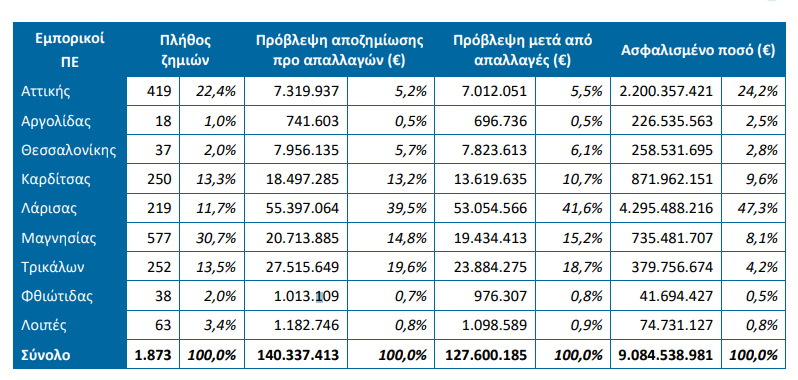 Οι περισσότερες ζημιές σε πλήθος (23,1% του συνόλου) των ασφαλίσεων περιουσίας συνέβησαν στην Μαγνησία, ενώ σε ποσό πρώτης εκτίμησης στη Λάρισα (40,7% του συνόλου).