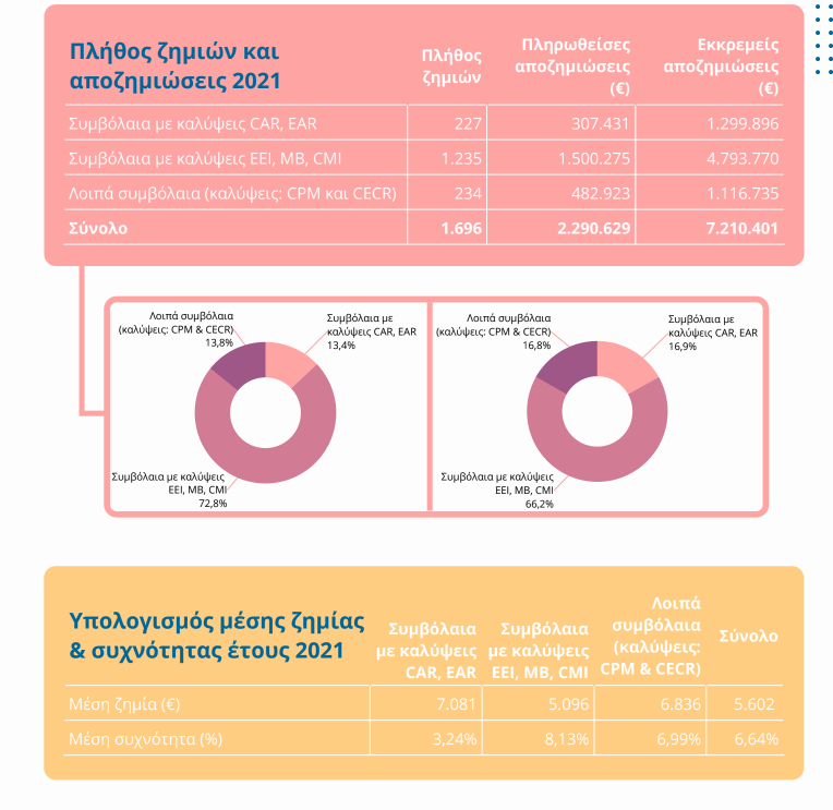Για τα συμβόλαια αυτά, δηλώθηκαν σχεδόν 1.700 ζημιές για τις οποίες οι εταιρίες – μέλη της ΕΑΕΕ κατέβαλαν εντός του 2021 αποζημιώσεις €2,29 εκατ. Παράλληλα σχηματίστηκε απόθεμα εκκρεμών αποζημιώσεων ύψους €7,21 εκατ.