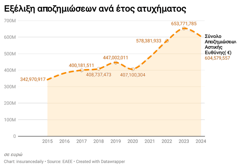 Σύμφωνα με τα στοιχεία που συγκεντρώνει το στατιστικό τμήμα της Ένωσης Ασφαλιστικών Εταιρειών Ελλάδος από το 2015 στο 2024 οι συνολικές αποζημιώσεις που καταβάλλουν οι ασφαλιστικές εταιρείες για υλικές ζημιές, κλοπές, ατυχήματα, ευθύνες προς τρίτους κ.οκ. εκτοξεύονται από τα 342.970.917 στα 604.579.557 ευρώ.
