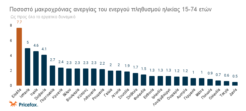 Η Ελλάδα καταγράφει το υψηλότερο ποσοστό (7,7%) μεταξύ των ευρωπαϊκών χωρών που εξετάστηκαν και για το ποσοστό μακροχρόνια ανέργων. Ακολουθεί ξανά η Ισπανία με 5% και η Ιταλία με 4,6%.