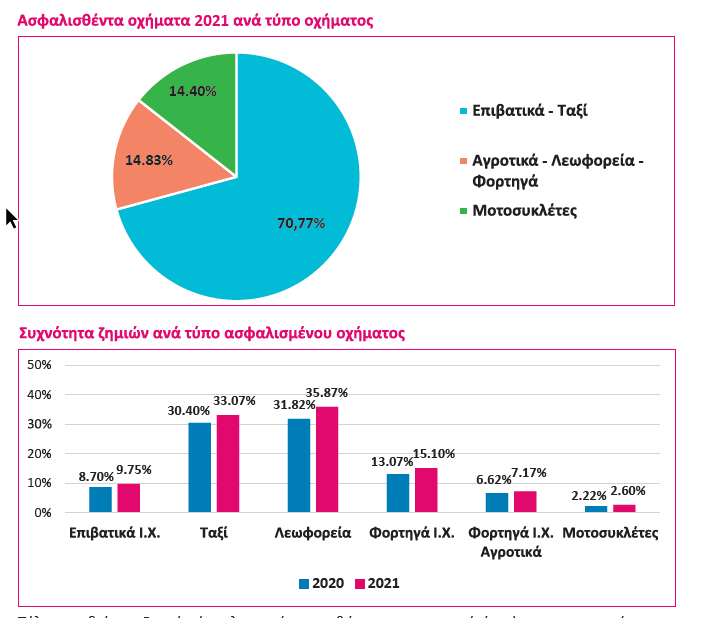 Η πλειοψηφία των ασφαλισθέντων οχημάτων το 70,77% είναι ΙΧ και ταξί, το 14,4% είναι μηχανές και το 14,83% αγροτικά, φορτηγά οχήματα και λεωφορεία.