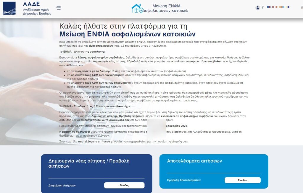 Όσοι ιδιοκτήτες μέσα στο 2023 είχαν ασφαλίσει την κατοικία τους για σεισμό, φωτιά και πλημμύρα, για τουλάχιστον τρεις μήνες, δικαιούνται τη χορήγηση μείωσης στον ΕΝΦΙΑ, που φτάνει έως και το 10% του φόρου. Μέχρι τις 22 Φεβρουαρίου που είναι και η καταληκτική ημερομηνία που έχει τεθεί από την ΑΑΔΕ μπορούν οι δικαιούχοι να υποβάλλουν τη σχετική αίτηση. Η διαδικασία είναι απλή και ολοκληρώνεται σε λίγα λεπτά: