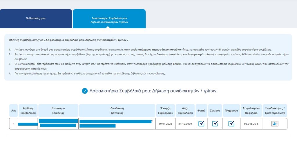 - Οι Συνιδιοκτήτες/Τρίτα πρόσωπα που θα εισάγετε στην αίτησή σας, θα πρέπει να εισέλθουν στην πλατφόρμα χορήγησης μείωσης ΕΝΦΙΑ, για να συσχετίσουν το ασφαλιστήριο συμβόλαιο με τον/ους ΑΤΑΚ που αποτελεί/ούν την ασφαλισμένη κατοικία τους.