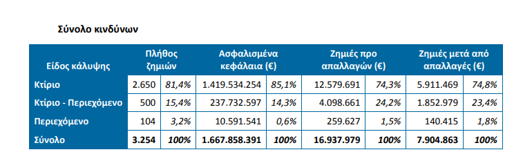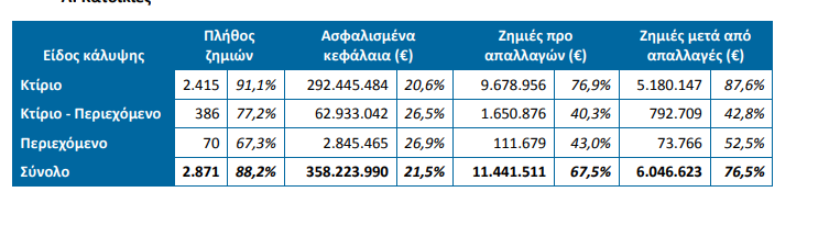 Η μέση δηλωθείσα ζημία ανέρχεται στα 5.205€, ενώ το μέσο ποσοστό ζημιάς (προ απαλλαγών) επί των ασφαλισμένων κεφαλαίων έφτασε στα 10,2‰. Ειδικότερα για τις ζημιές που υπέστησαν οι ασφαλισμένες κατοικίες δηλώθηκαν τα ακόλουθα. Τα ποσοστά αναφέρονται στην συμμετοχή των κατοικιών στο αντίστοιχο μέγεθος του συνόλου των κινδύνων.