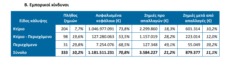 Η μέση δηλωθείσα ζημία ανέρχεται στα 3.985€, ενώ το μέσο ποσοστό ζημιάς (προ απαλλαγών) επί των ασφαλισμένων κεφαλαίων έφτασε στα 31,9‰. Για τις ζημιές που υπέστησαν οι ασφαλισμένοι εμπορικοί κίνδυνοι δηλώθηκαν τα ακόλουθα. Τα ποσοστά αναφέρονται στην συμμετοχή των εμπορικών κινδύνων στο αντίστοιχο μέγεθος του συνόλου των κινδύνων.