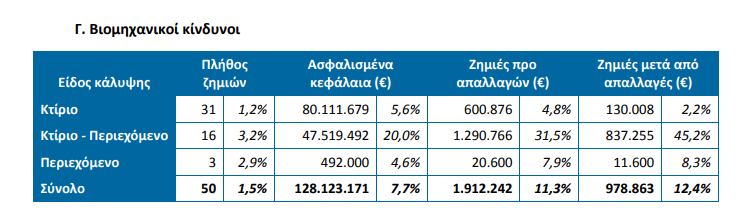 Η μέση δηλωθείσα ζημία ανέρχεται στα 10.763€, ενώ το μέσο ποσοστό ζημιάς (προ απαλλαγών) επί των ασφαλισμένων κεφαλαίων έφτασε στα 3‰. Για τις ζημιές που υπέστησαν οι ασφαλισμένοι βιομηχανικοί κίνδυνοι δηλώθηκαν τα ακόλουθα. Τα ποσοστά αναφέρονται στην συμμετοχή των βιομηχανικών κινδύνων στο αντίστοιχο μέγεθος του συνόλου των κινδύνων.