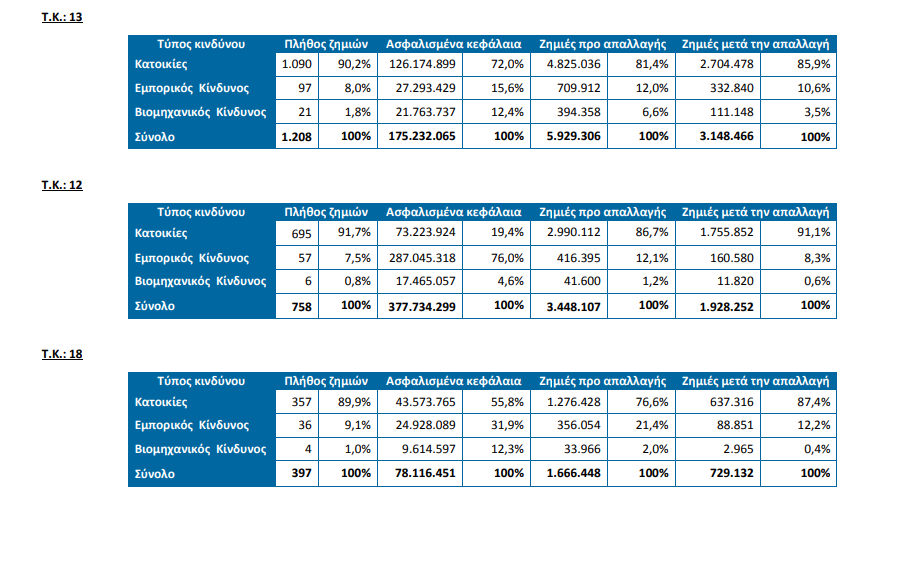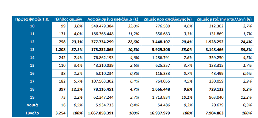 Ακολουθεί σε συνοπτικό πίνακα η κατανομή των ασφαλισμένων κεφαλαίων και των ζημιών με βάση τα δύο πρώτα ψηφία του Τ.Κ. που επλήγη.